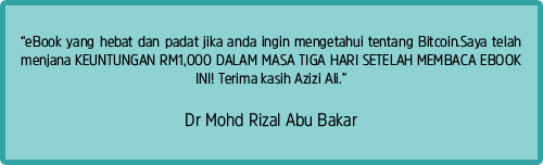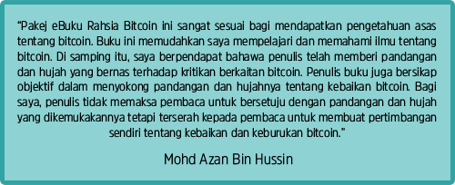 Mungkin ada pembaca yang masih berkata harga Pakej eBook ini adalah tinggi. TETAPI APA YANG LEBIH PENTING DARIPADA HARGA IALAH ILMU YANG SAYA TAWARKAN. Realitinya anda tidak akan mendapat ilmu untuk buat duit ini dalam bitcoin ini dengan senang. Ianya adalah hampir mustahil untuk anda mendapatkan ilmu bitcoin yang tepat, neutral (tidak berat sebelah) dan komprehensif daripada orang lain! Kalau ada orang bercerita pun, mereka akan memberikan bayangannya saja; mereka tidak akan menceritakan ilmunya dari A hingga Z seperti yang saya lakukan dalam Pakej eBook ini. Ya, saya menceritakan semuanya dengan komprehensif di dalam eBook saya.