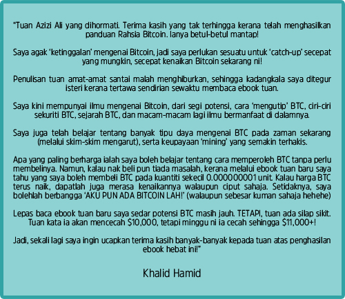 Azizi Ali tidak pernah memberi kebenaran kepada mana-mana pihak atau individu selain daripada BillPlz untuk menjual Pakej eBook Rahsia Bitcoin ini. Jika anda mahukan kepastian tentang sumber jualan, Whatsapp kepada 011-1520 2746.